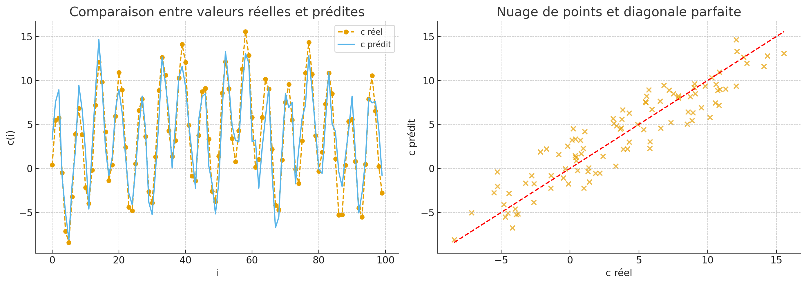 import math import random import numpy as np from sklearn.linear_model import LinearRegression from sklearn.metrics import r2_score# Initialisation des listes f, g, h, c = [], [], [], []# Calcul des données pour i = 0 à 99 for i in range(100): f_val = math.sin(i) + random.random() g_val = 2 * math.sin(i * 0.3) + random.random() h_val = math.sin(i * 0.03) + 2 * random.random() c_val = (7 * math.sin(i) - 3 * math.sin(i * 0.3) + 5 * math.sin(i * 0.03) + random.random()) f.append(f_val) g.append(g_val) h.append(h_val) c.append(c_val)# Conversion en arrays numpy X = np.column_stack([f, g, h]) # variables explicatives y = np.array(c) # variable cible# Création et entraînement du modèle model = LinearRegression() model.fit(X, y)# Prédiction y_pred = model.predict(X)# Coefficient de détermination R^2 r2 = r2_score(y, y_pred)print("Coefficients :", model.coef_) print("Intercept :", model.intercept_) print("Coefficient de détermination R^2 :", r2)