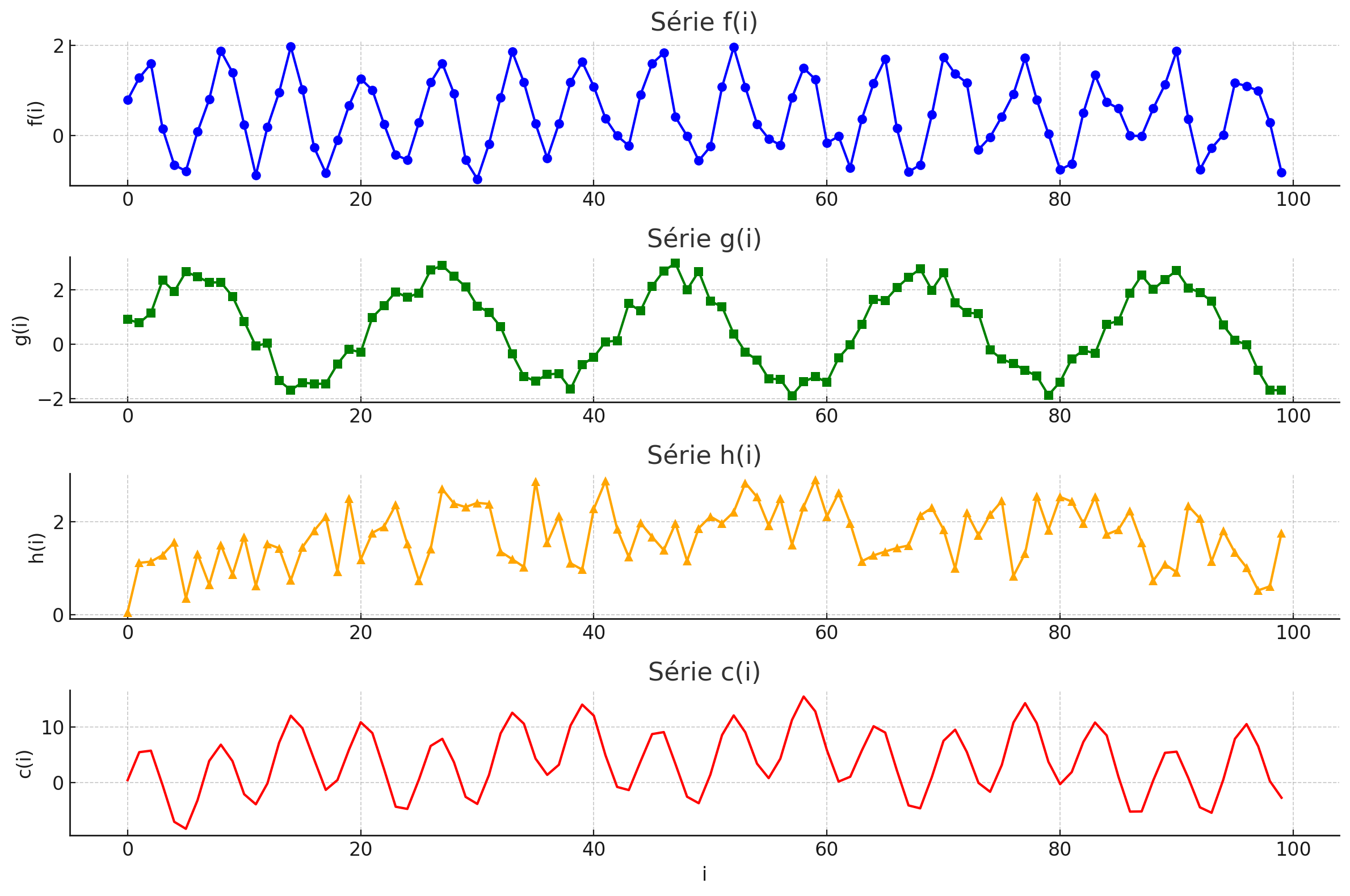 Voici un programme Python qui calcule les 100 premières valeurs des fonctions demandées et les stocke dans des listes distinctes : import math import random# Initialisation des listes f = [] g = [] h = [] c = []# Boucle de calcul pour i = 0 à 99 for i in range(100): rand_val = random.random() # nombre aléatoire dans [0,1)f_val = math.sin(i) + random.random() g_val = 2 * math.sin(i * 0.3) + random.random() h_val = math.sin(i * 0.03) + 2 * random.random() c_val = (7 * math.sin(i) - 3 * math.sin(i * 0.3) + 5 * math.sin(i * 0.03) + random.random())f.append(f_val) g.append(g_val) h.append(h_val) c.append(c_val)# Exemple d'affichage des 10 premières valeurs print("f[:10] =", f[:10]) print("g[:10] =", g[:10]) print("h[:10] =", h[:10]) print("c[:10] =", c[:10])